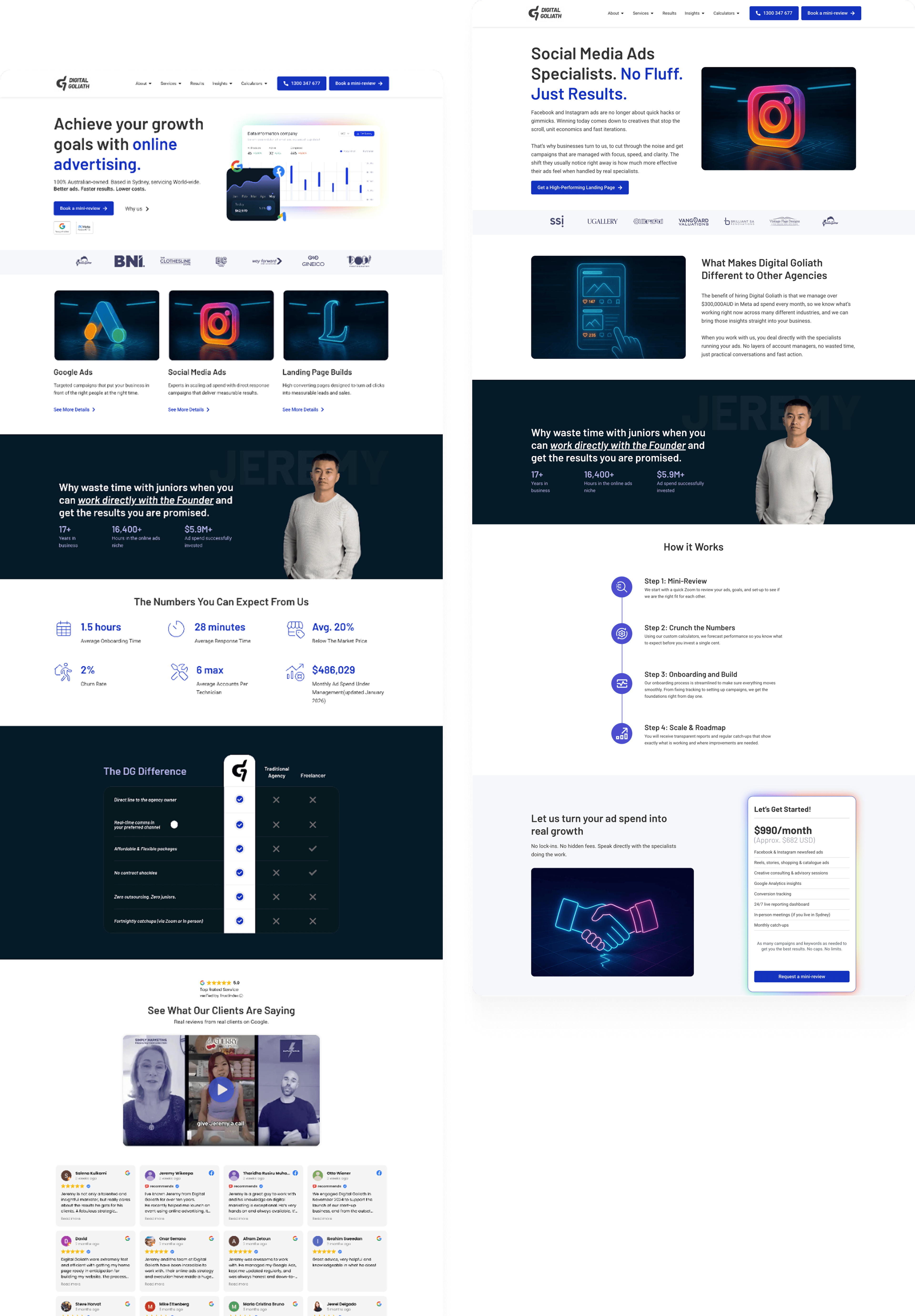 Digital Goliath, an Australian agency specializing in Google, Facebook, and LinkedIn ads, required a fast, on-brand website revamp. The primary objective was to upgrade their UI/UX to better reflect their expertise while maintaining their existing infrastructure on WordPress and Elementor.